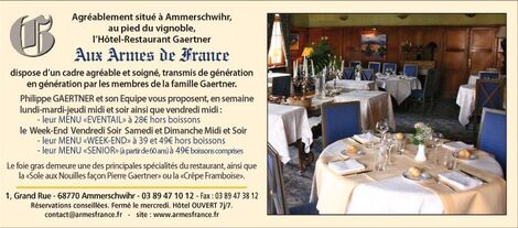 Le restaurant Aux armes de France est un des restaurants les plus réputés d'Alsace, et sa renommée a largement dépassé les frontières de la région depuis 2005, où le guide Michelin a décerné une deuxième étoile au restaurant.
