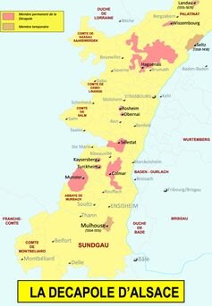 On remarquera néanmoins l’absence de Strasbourg qui, malgré sa force et son statut de ville libre, préfèrera toujours rester hors de la Décapole.