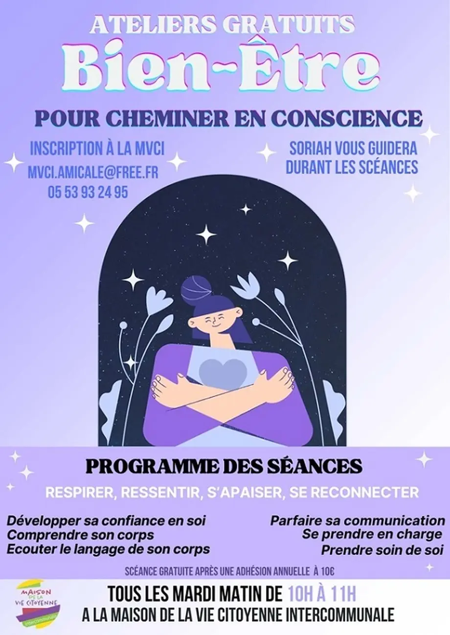 La Maison de la Vie Citoyenne Intercommunale vous invite à participer à un atelier bien-être pour cheminer en conscience. La séance est animée par Soriah.