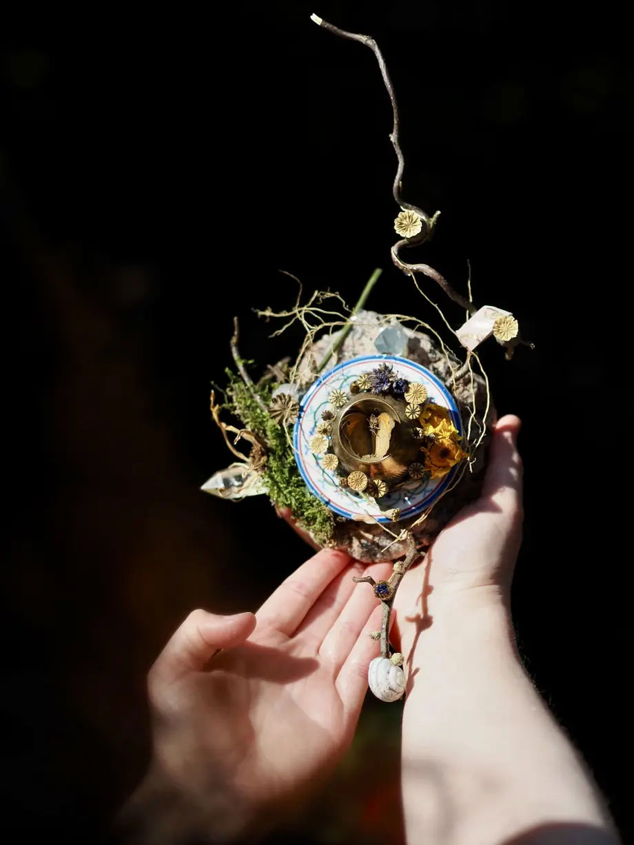 Le matériel fourni comprend colle et petits objets naturels : fleurs séchées, mousse, branches… Chaque participant est également invité à apporter ses objets significatifs — talismans, bijoux, pendentifs ou bibelots — qui seront intégrés dans la composition finale. Cette approche permet de créer des œuvres profondes et chargées de sens, en résonance avec la personne qui les réalise.