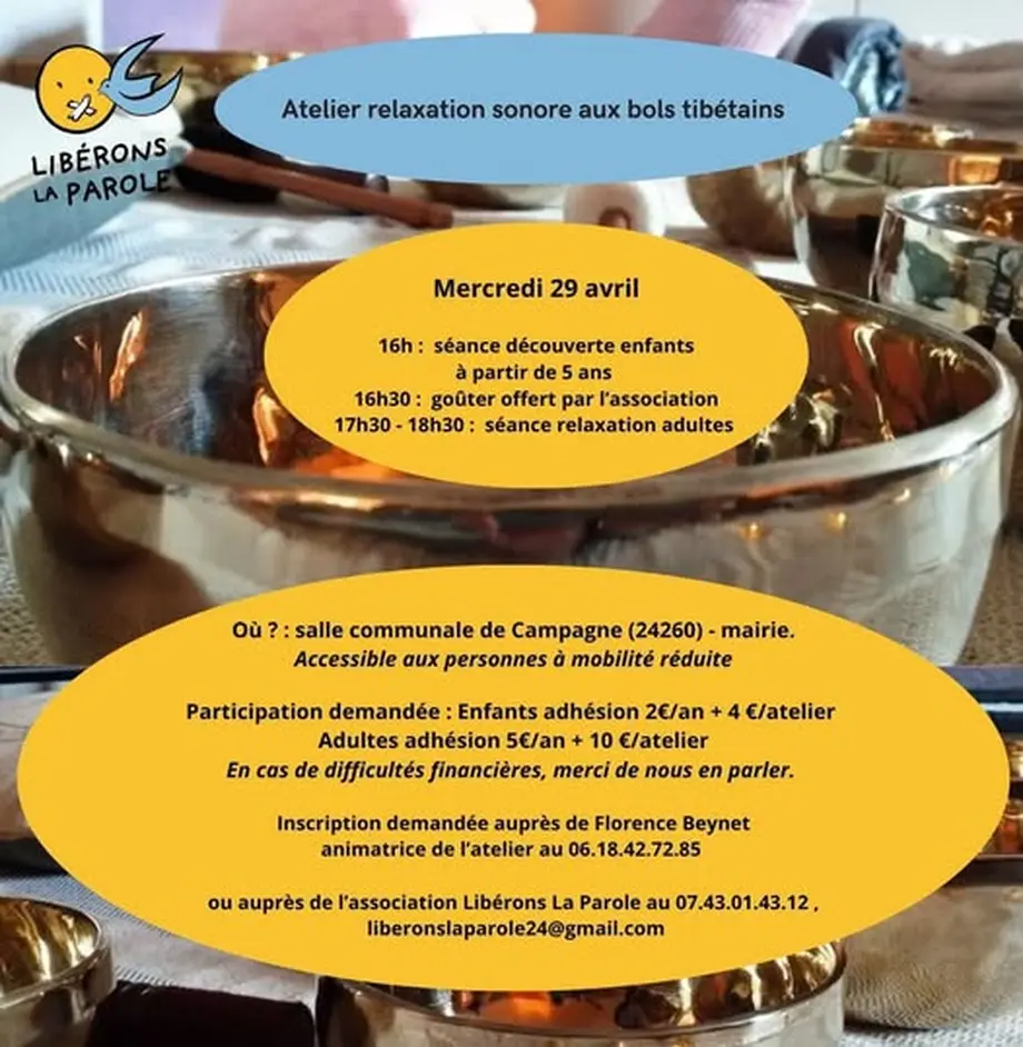 L'association Libérons La Parole invite petit-e-s et grand-e-s à embarquer pour une relaxation sonore aux bols tibétains, le mercredi 29 avril à Campagne.