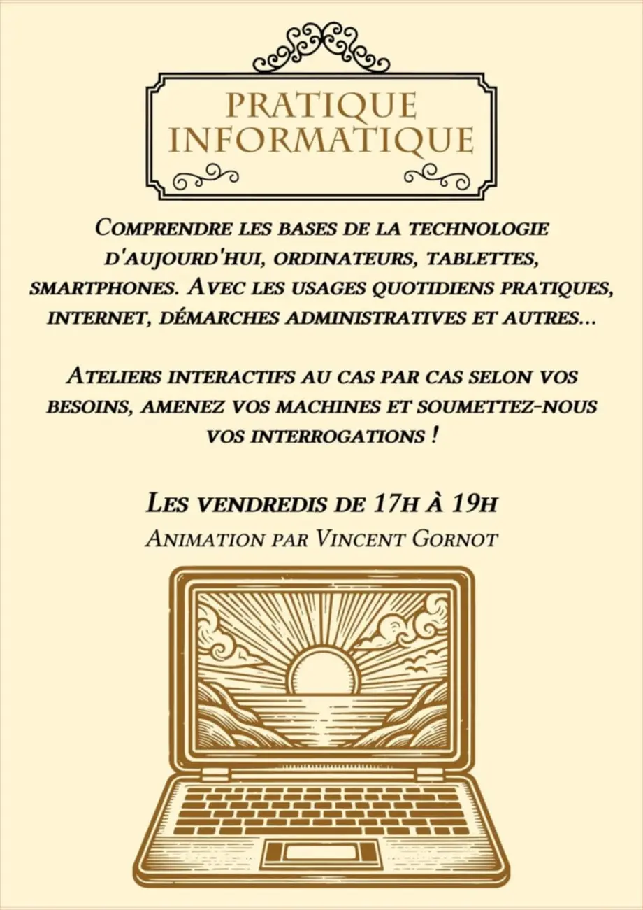 Rendez-vous au Comptoir des échanges, les vendredis, de 17 h à 19 h, pour comprendre les bases de la technologie d’aujourd’hui (tablettes, ordinateurs, smartphones) ainsi que les usages quotidiens pratiques : Internet, démarches administratives, etc. Atelier interactif, au cas par cas selon vos besoins, animé par Vincent Gornot.
