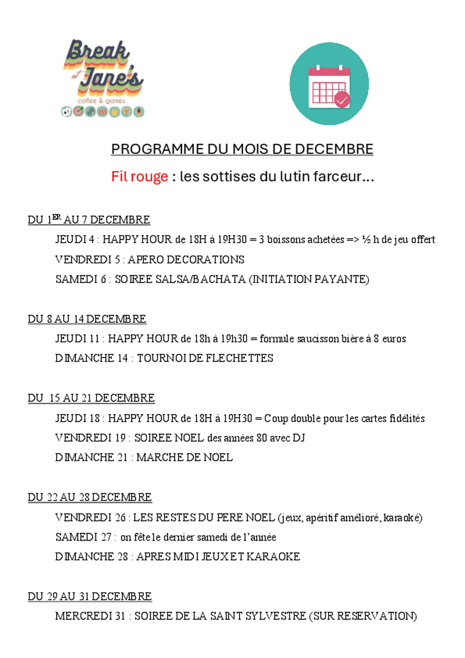 Programme du mois de Décembre au Break at Jane's- Pouilly en Auxois