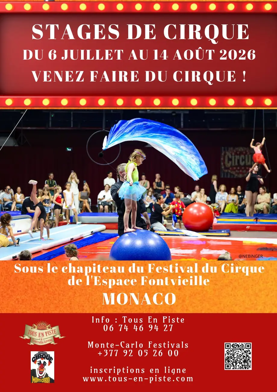 Du 6 Juillet au 14 aout 2026 sous les chapiteau du Festival International du Cirque de Monte-Calo. Une occasion de découvrir les arts du cirque, une activité ludique, sportive et artistique pour les enfants à partir de 4 ans et ados.