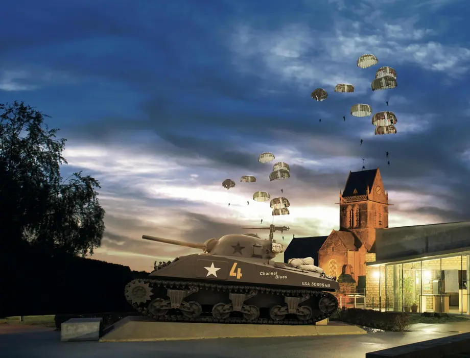 Un char d'assaut portant le chiffre 4 est exposé à l'extérieur, avec plusieurs parachutes descendant du ciel. Une église est visible à l'arrière-plan.