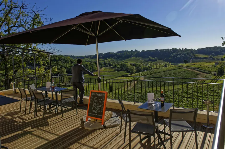 Terrasse d'un restaurant en plein air avec des tables et des chaises sous de grands parasols, avec vue sur un vignoble luxuriant. Une personne se tient près de la balustrade.