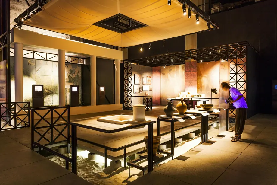 Exposition de poteries et d'objets anciens dans une salle bien éclairée avec des grilles en bois et un sol illuminé.