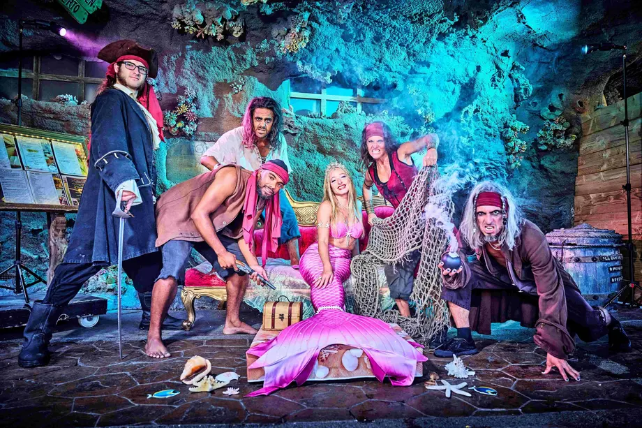 Un groupe de personnes habillées en pirates et en sirène pose dans un décor sous-marin avec des accessoires tels qu'un coffre au trésor et des coquillages.
