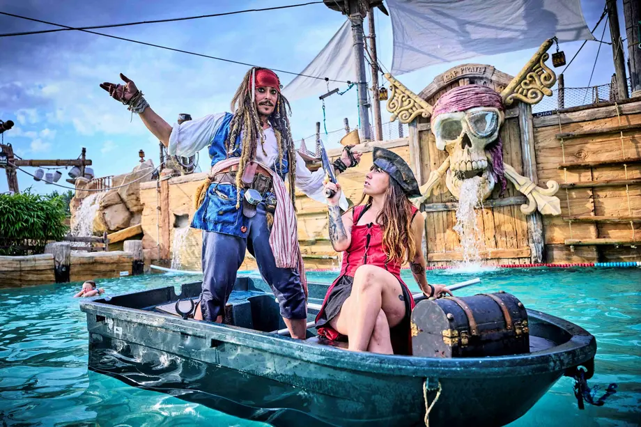 Deux personnes en costume de pirate sur un petit bateau dans une attraction aquatique à thème avec une grande tête de mort en arrière-plan.