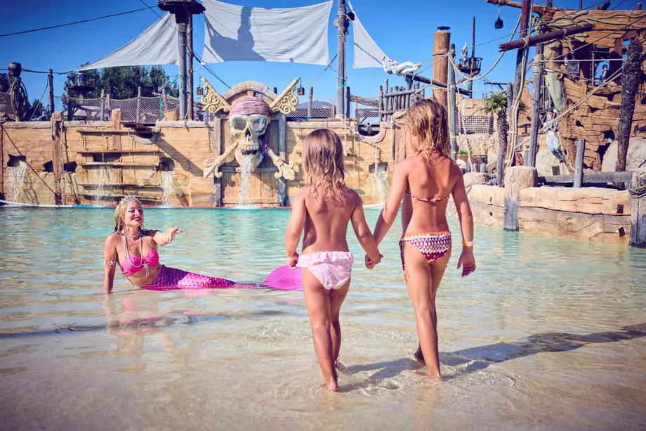 Deux enfants se tiennent dans l'eau peu profonde face à un artiste déguisé en sirène, près d'une toile de fond sur le thème des pirates.