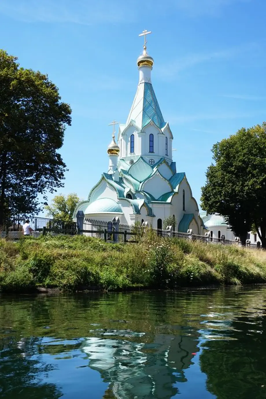 Un peu après le Port Autonome de Strasbourg, l'Eglise Orthodoxe Russe et ses dômes rappelant fortement l'architecture du nord de la Russie. C'est le plus récent des nouveaux bâtiments remarquables à Strasbourg. On l'aperçoit fort bien depuis l'Ill.