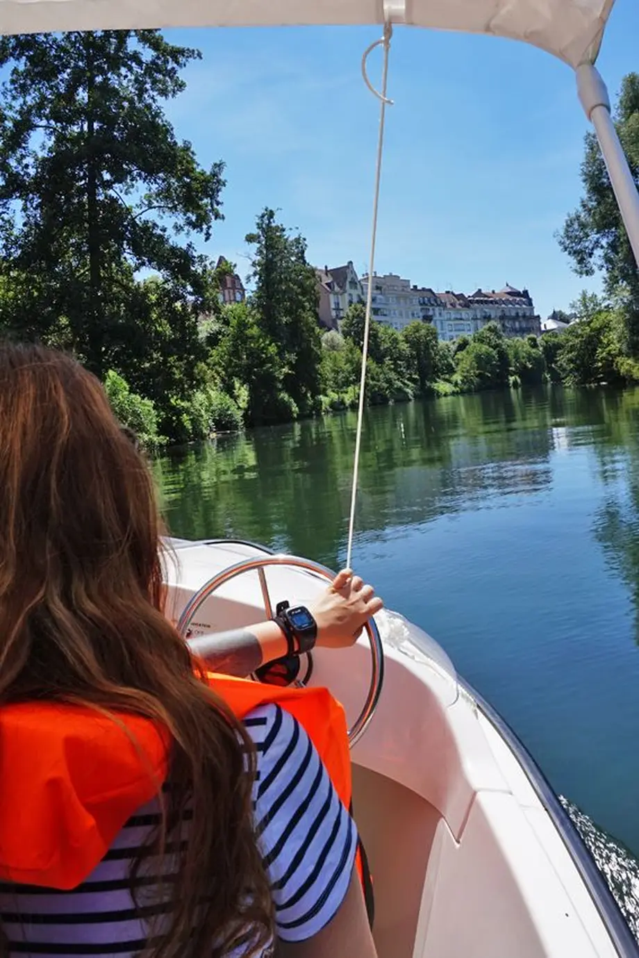 Un petit mot tout de même sur le pilotage de votre embarcation ! C'est simple comme bonjour. Un bouton "marche/arrêt" et une molette "marche avant/marche arrière". C'est tout ! Ah oui, et un volant, forcément... Vous ne dépasserez jamais les 9km/h, même dans le sens du courant. La balade se fait donc à un rythme de sénateur. Les batteries électriques ne font quasiment aucun bruit et permettent d'éviter de passer par la case "carburant" - qui coûte cher. Des batteries tellement silencieuses que plusieurs canards ne nous ont pas entendus arriver... (pris "comme un lapin dans les phares" dit-on)