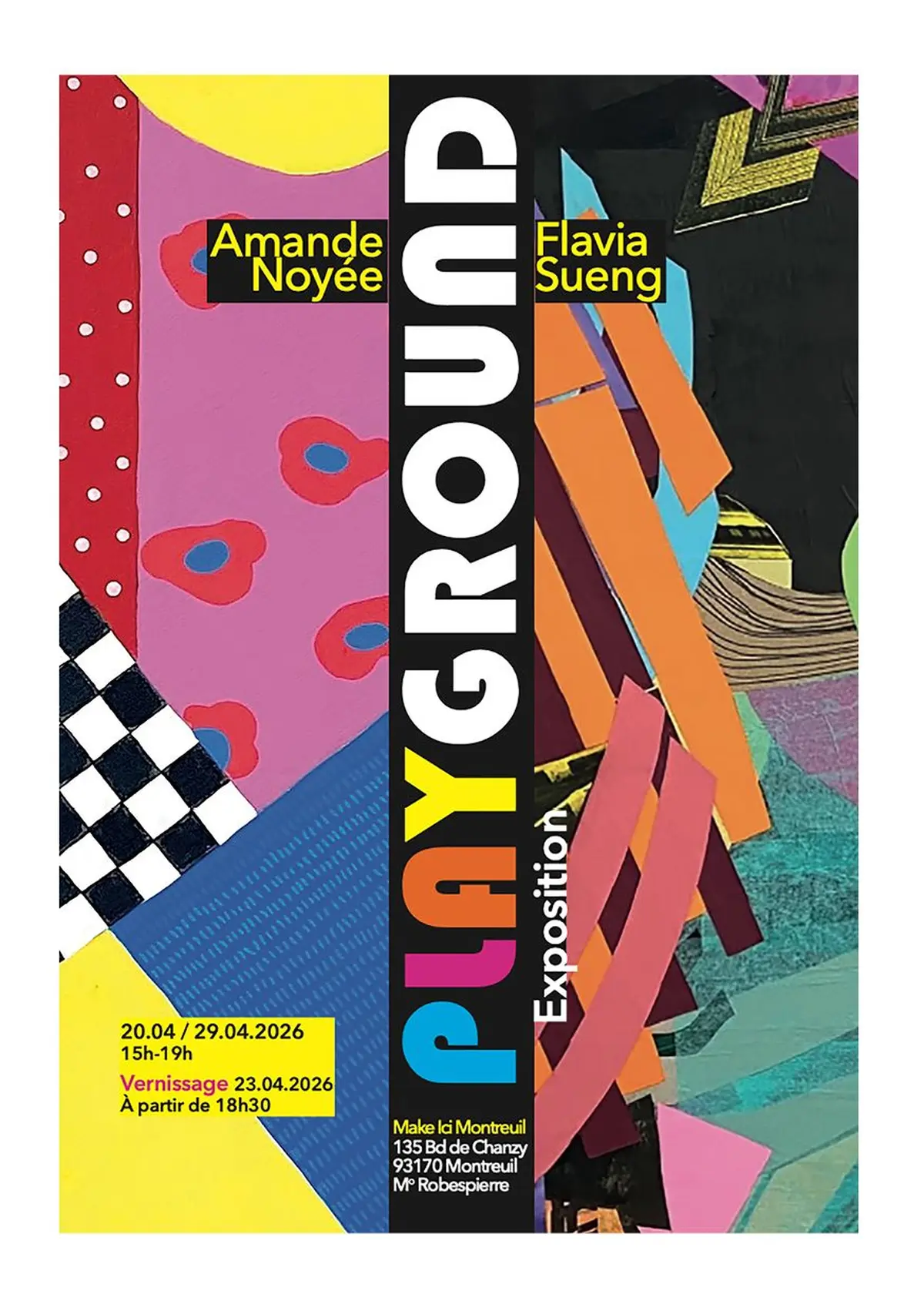 Jusqu'au 29 avril, l'exposition Playground d'Amande Noyée et Flavia Sueng est visible à Make Ici Montreuil, au 135 Boulevard de Chanzy. Cette installation immersive d'art contemporain fait sortir la couleur des murs pour l'étendre à tout l'espace : collages, surfaces peintes, installations textiles et volumes suspendus créent une architecture sensorielle mouvante où le visiteur devient acteur d'une composition vivante. L'exposition est accessible du jeudi au dimanche de 15h à 19h, et l'entrée est gratuite. Un événement sélectionné pour son accessibilité, sa singularité et l'expérience corporelle et sensorielle qu'il propose.