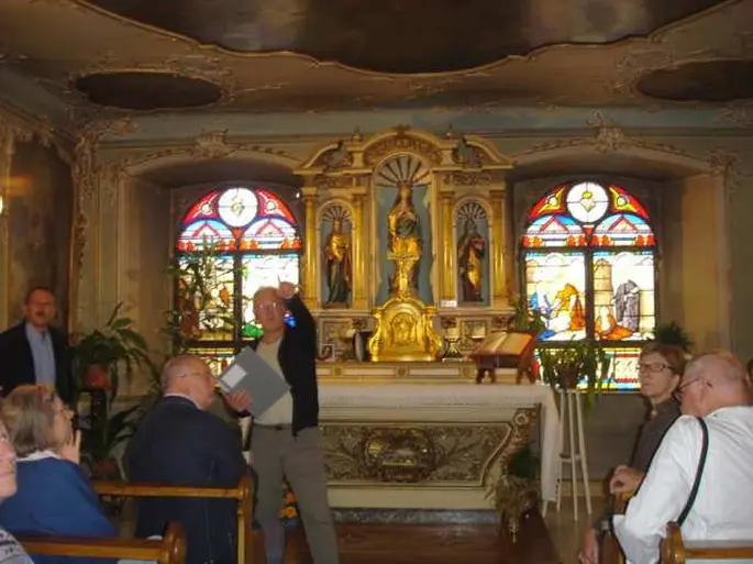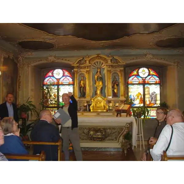 Il est possible d’admirer 2 sculptures de Saint Christophe et Saint Morand, une croix en bois et les pierres tombales des prieurs Chuno (XIVème siècle) et Grantner (XVIème siècle).
