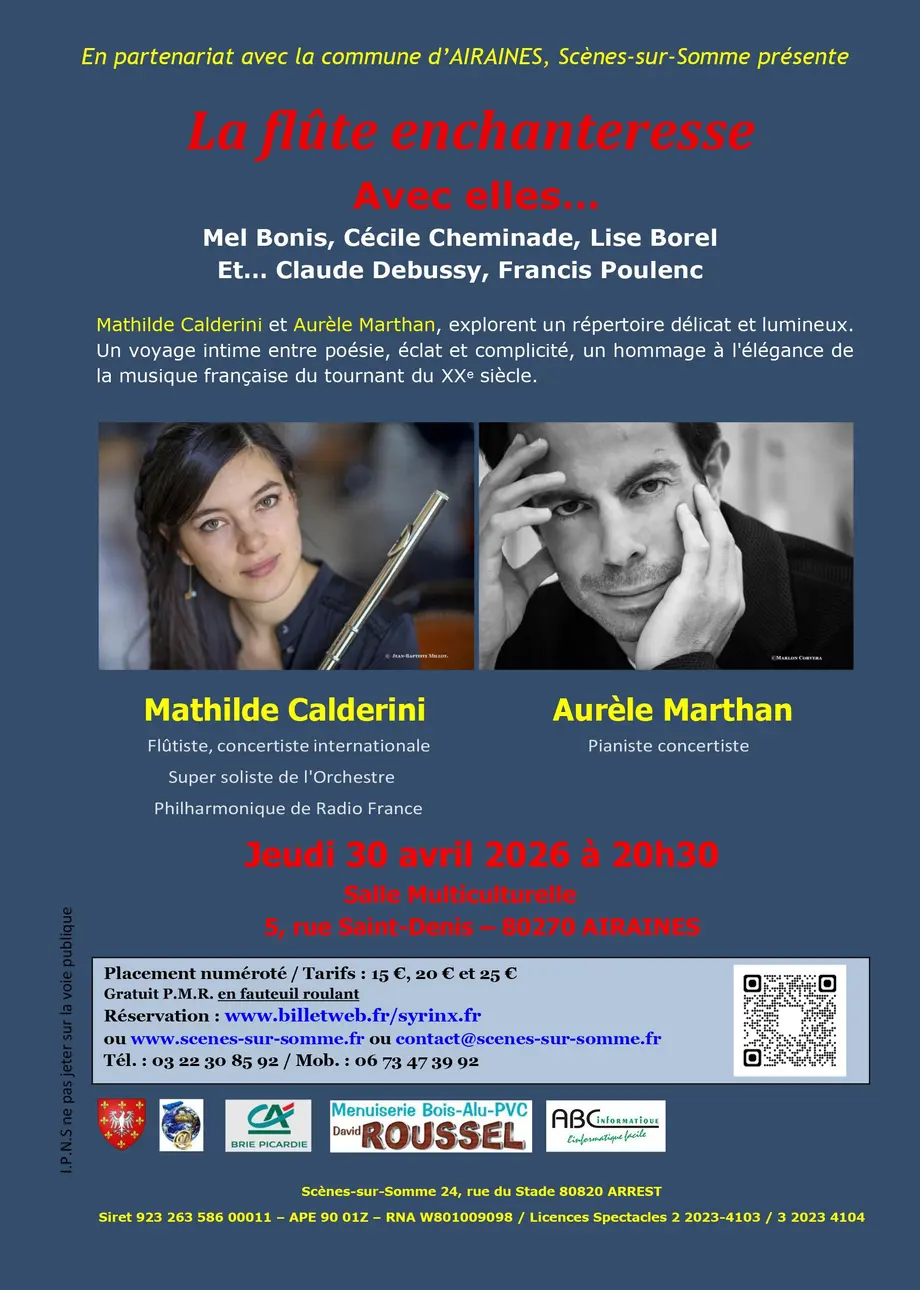 Après le succès en 2024 de Neïma Naouri à Woincourt et en 2025 du Sirba Octet à Hallencourt, nous vous proposons un nouveau concert de prestige avec deux artistes exceptionnels. Mathilde Calderini, flûtiste concertiste internationale et super soliste de l’Orchestre de Radio France, s’unit au pianiste concertiste Aurèle Marthan pour redonner vie à une génération de compositrices trop longtemps restées dans l’ombre.