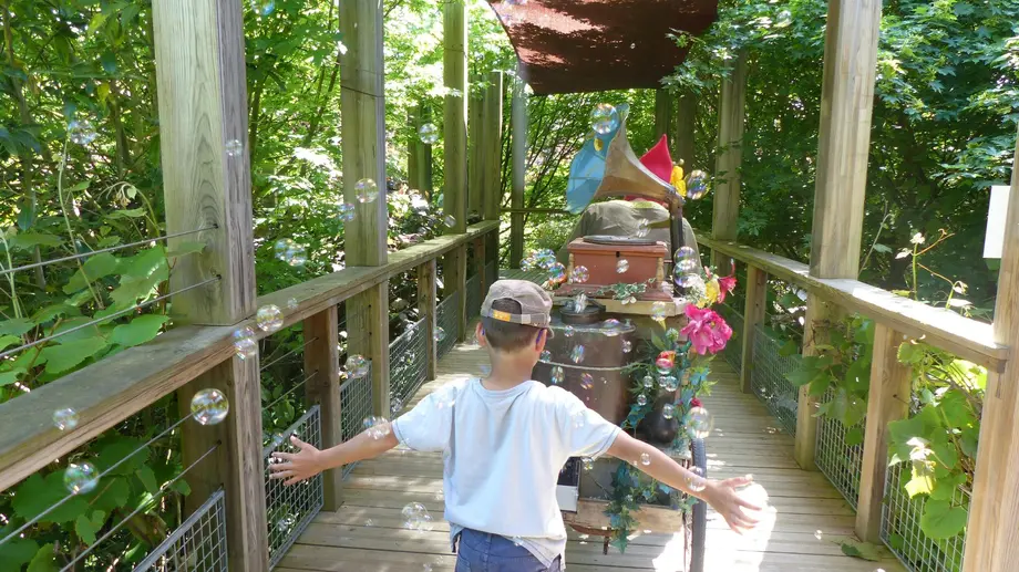Un enfant aux bras tendus savoure des bulles près d'un tourne-disque vintage sur un chemin en bois dans un cadre verdoyant et luxuriant.