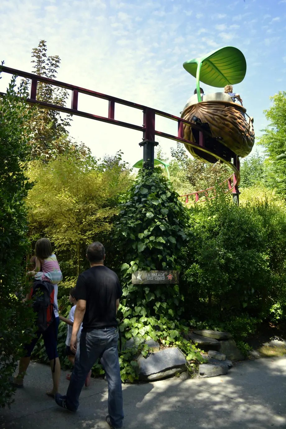 Une famille se promène sous une piste de montagnes russes rouges, entourée de verdure et d'arbres denses, avec un chariot de manège sur le thème du nid au-dessus.