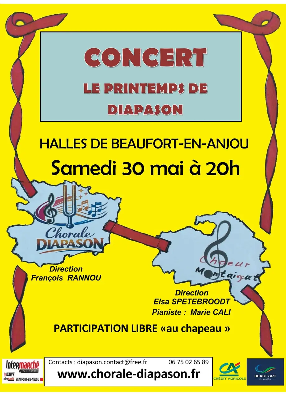 Le concert du Printemps de Diapason réunira les deux formations et aura lieu le samedi 30 mai dans les Halles de Beaufort en Anjou, place des Halles, à 20 H. Entrée côté église, accessibilité PMR. pas de réservation. Site internet : http://www.chorale-diapason.fr - Contact diapason.contact@free.fr ou 06 75 02 65 89.