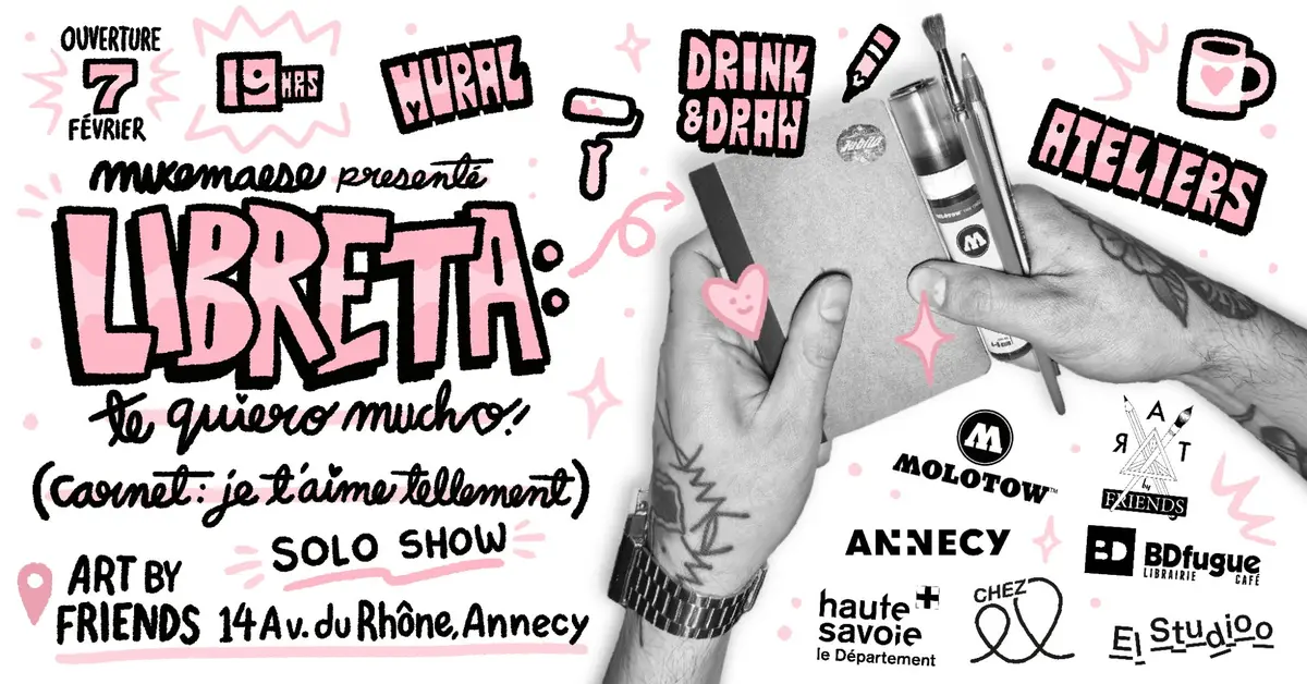 La galerie ART BY FRIENDS présente l'exposition LIBRETA : te quiero mucho de Mike Maese à Annecy jusqu'au 21 février. Cet artiste mexicain pluridisciplinaire dévoile ses carnets de dessins et esquisses dans une exposition intimiste avenue du Rhône. Ses palettes colorées et contrastes assumés, inspirés par ses voyages à travers le Mexique, captivent par leur énergie créative. L'occasion rare de découvrir l'univers d'un artiste qui collabore avec des géants comme Netflix et Spotify, tout en développant une pratique personnelle authentique.