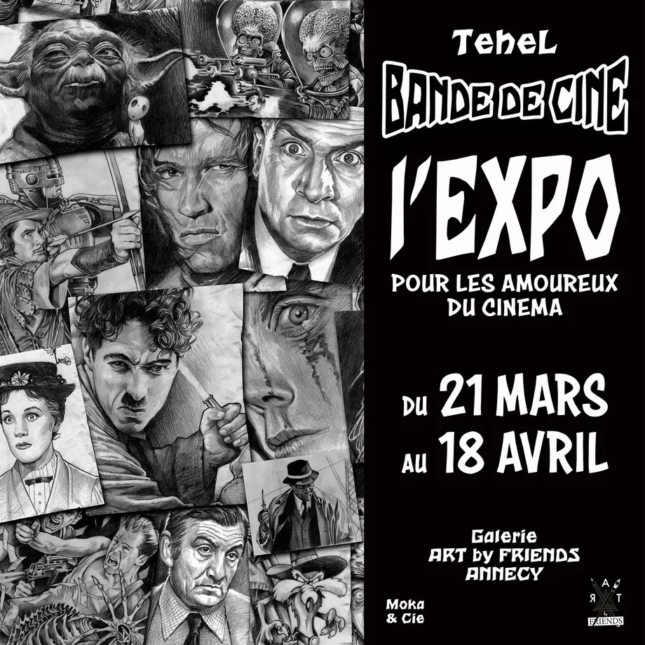 du 21 mars au 18 avril 2026,la galerie Art by Friends présente BANDE DE CINE, le projet au long cours de TEHEL, fidéle complice de Mokamag.