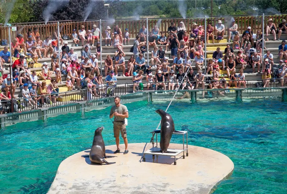 Une foule regarde un dresseur s'exercer avec deux otaries sur une plate-forme au bord d'une piscine.