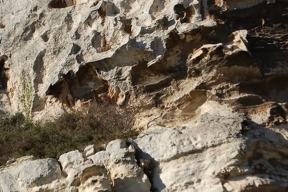 Falaise rocheuse avec un buisson poussant dans une crevasse. La lumière du soleil met en valeur la surface rugueuse et texturée.