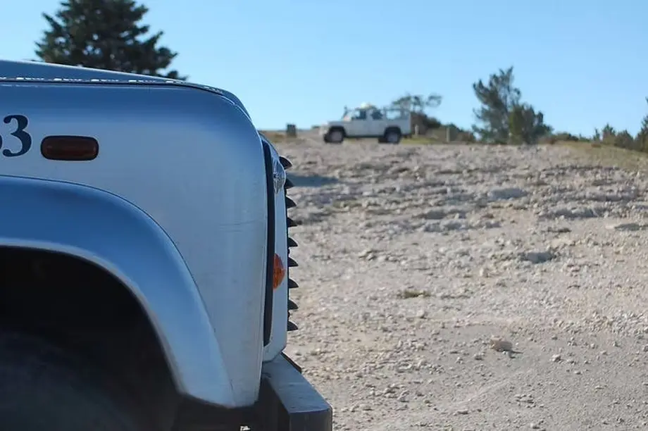 Vue frontale d'un véhicule argenté sur un terrain accidenté et d'un véhicule blanc en arrière-plan, sous un ciel bleu clair.