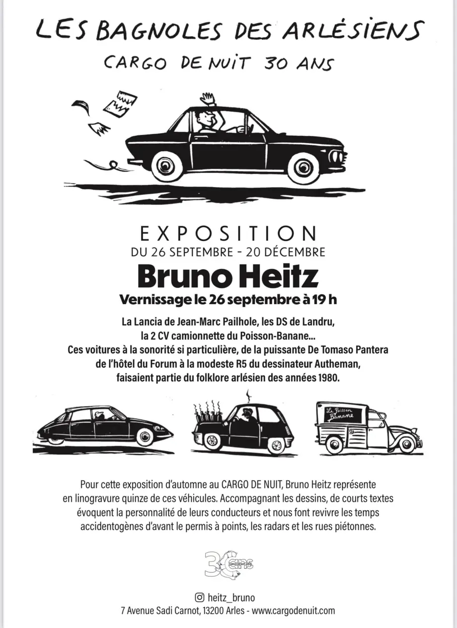 Pour cette exposition d’automne au CARGO DE NUIT, Bruno Heitz représente en linogravure quinze de ces véhicules. Accompagnant les dessins, de courts textes évoquent la personnalité de leurs conducteurs et nous font revivre les temps accidentogènes d’avant le permis à points, les radars et les rues piétonnes.