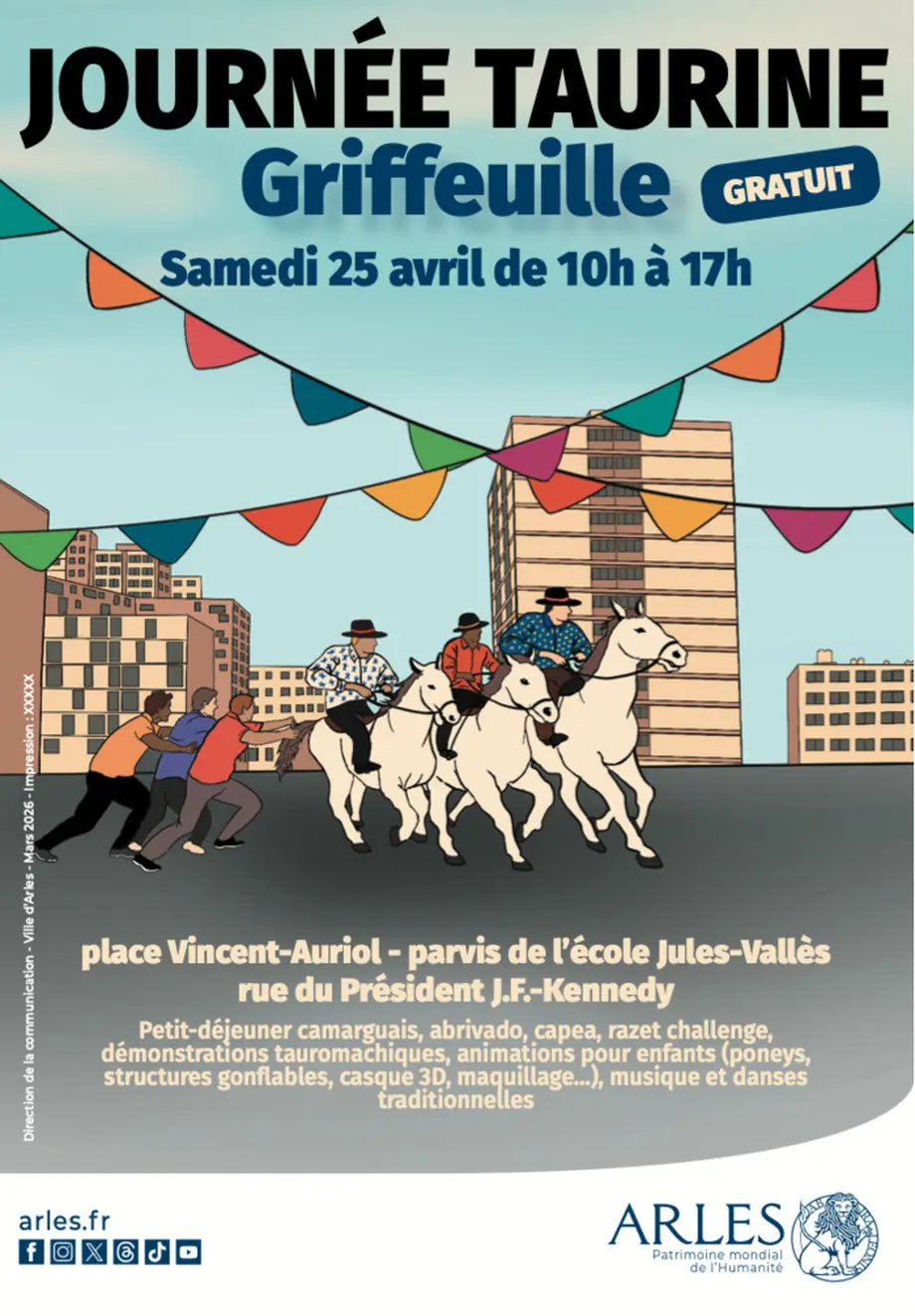 Journée taurine des AlyscampsLe 16/04/2026ArlesPendant les vacances scolaires, la Ville d'Arles propose une après-midi festive de sensibilisation aux traditions taurines.