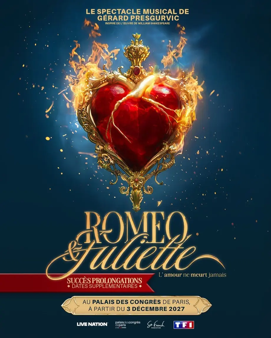 Roméo & Juliette revient sur scène en 2027 avec un événement exceptionnel au Palais des Congrès de Paris. La comédie musicale culte de Gérard Presgurvic retrouve la capitale française avec la réunion rare de Damien Sargue et Cécilia Cara, les interprètes originaux. Ce spectacle musical, qui a conquis plus de 11 millions de spectateurs dans le monde, propose une version repensée de l'histoire d'amour tragique shakespearienne. Les fans peuvent dès maintenant réserver leurs billets pour découvrir ce spectacle modernisé qui célèbre 25 ans de succès international. Une occasion unique d'acheter des places pour cette production exceptionnelle qui marquera l'année théâtrale.