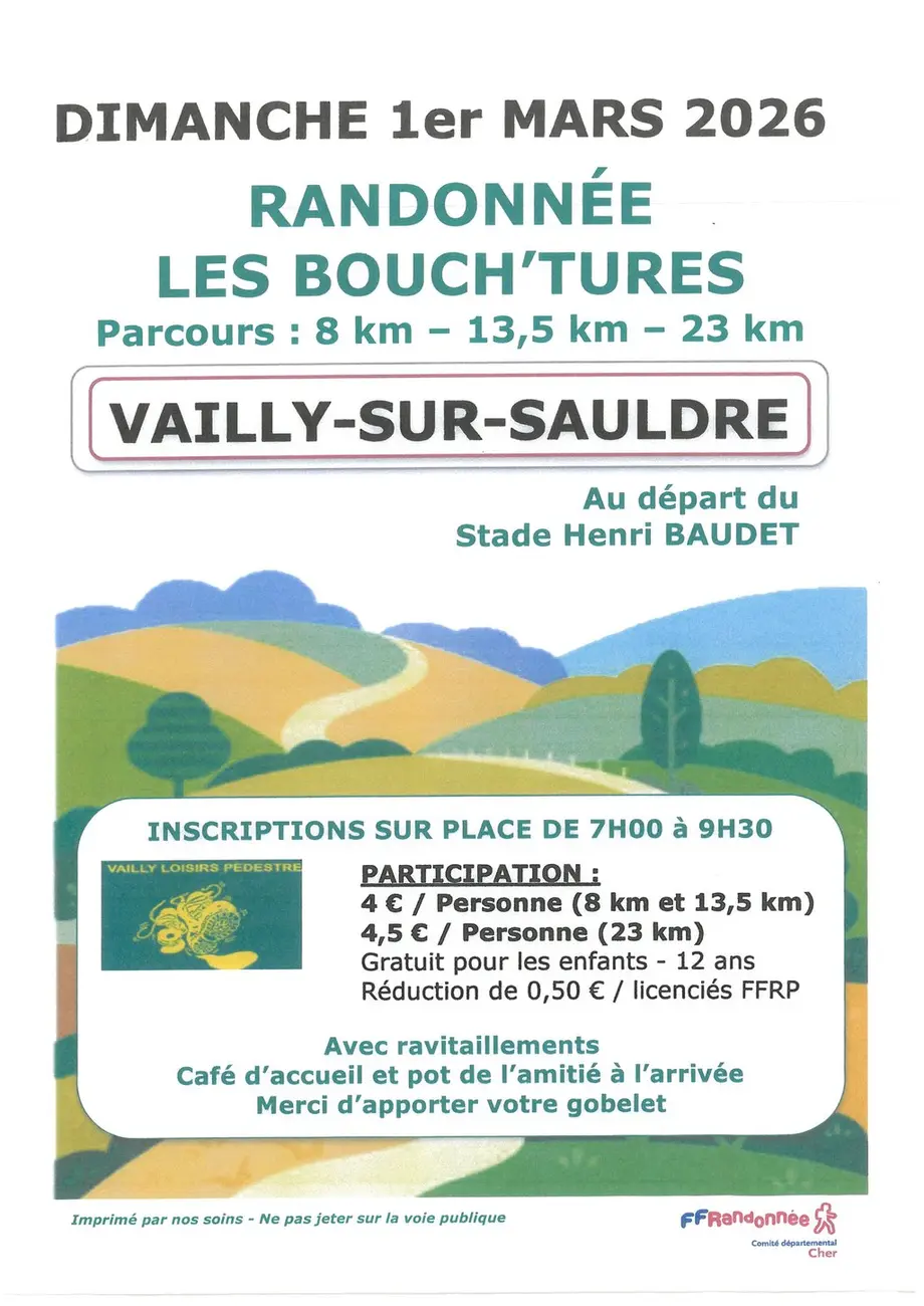 36ème Randonnée de la SauldreLe 08/03/2026 Argent-sur-Sauldre3 parcours : 23, 13 et 8 km.