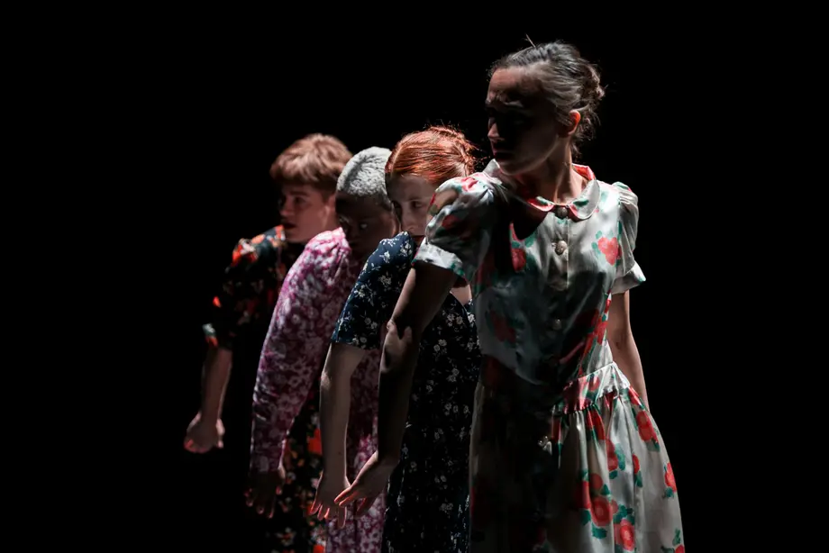 Sur scène, des robes : de soirée, de mariée, de chambre, de tous les jours, de bal. À paillettes, longues, bouffantes, ajustées, trop grandes. Des robes qui volent, qui brillent, qui craquent, qui tournent, qui traînent ou qui tombent. Des robes empire, à baleines, de celles qui valsent sur Leonard Cohen, ou bien des robes en pleurs, mal cousues, légères, sans armatures, nouées sur le ventre. Et puis des robes seules, rebelles, enjouées sur fond de basses électroniques. Sur le plateau, elles sont cinq à porter ces robes. Cinq danseuses qui transpirent parce que vivantes.
