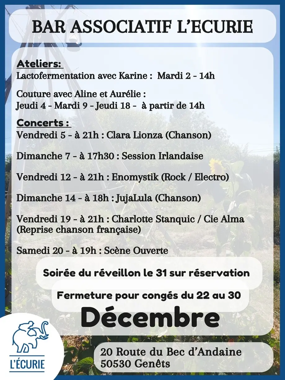 Concert "Charlotte Stanquic"Le 19/12/2025 GenêtsDîner-concert avec Charlotte Stanquic – Cie Alma : reprises de chansons françaises.