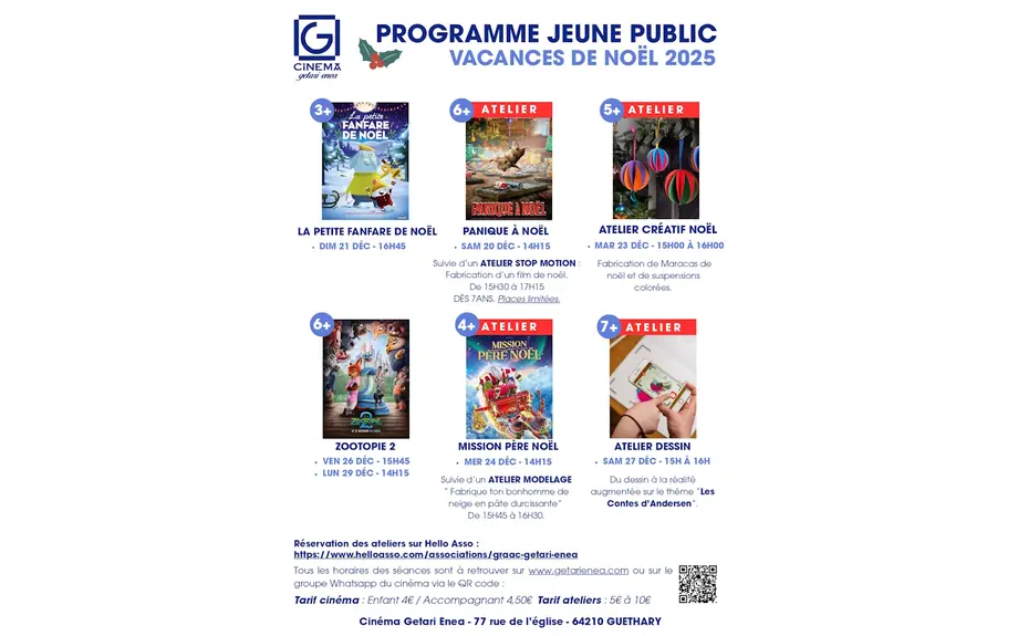Atelier modelageLe 24/12/2025 GuétharySéance de cinéma Mission Père Noël à 14h15, suivie d’un atelier de modelage à 15h45 : Fabrique ton bonhomme de neige en pâte durcissante.