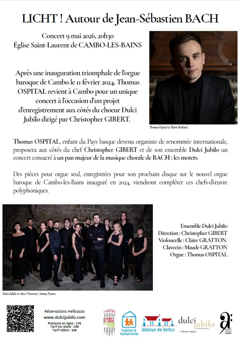 Après une inauguration triomphale de l’orgue baroque de Cambo le 11 février 2024, Thomas OSPITAL revient à Cambo pour un unique concert à l’occasion d’un projet d’enregistrement, aux côtés du chœur Dulci Jubilo dirigé par Christopher GIBERT.
