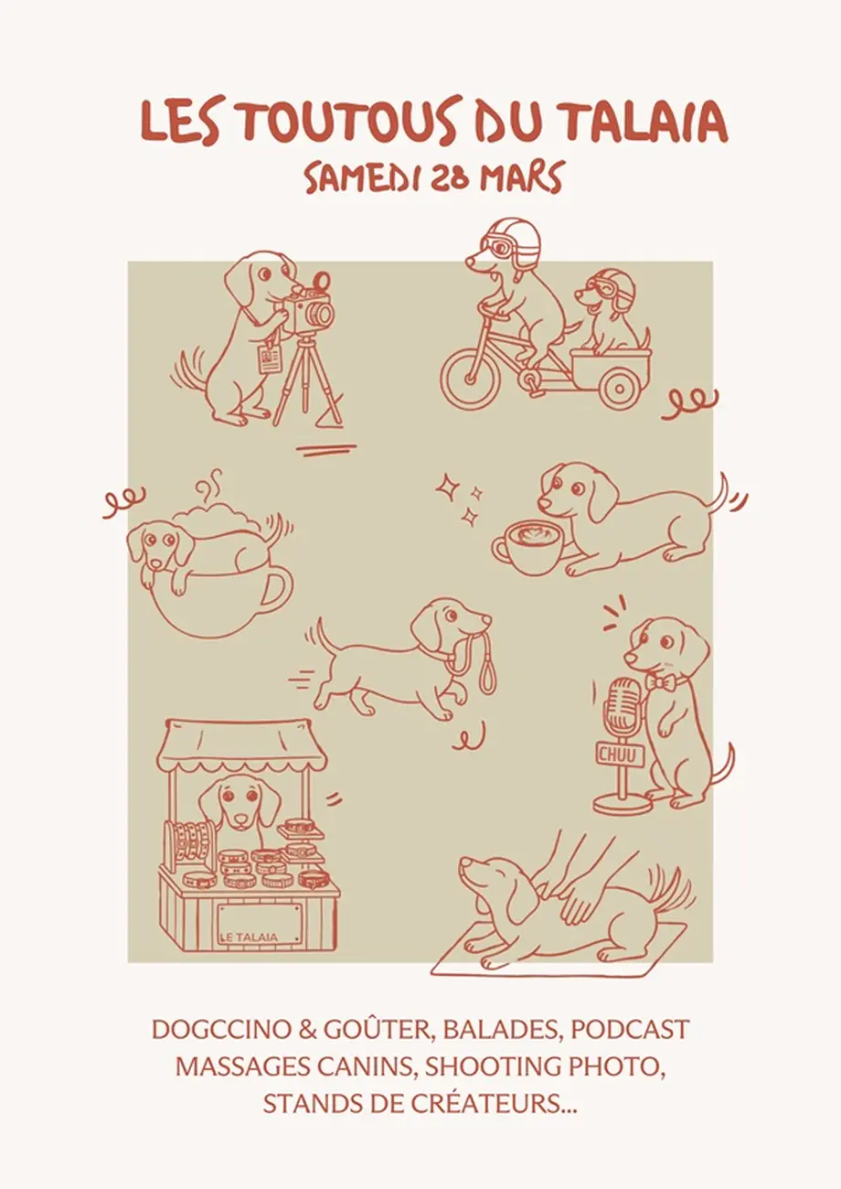 Dégustez un dogccino et des pâtisseries pour chiens et humains. Nos créateurs et experts canins vous présenteront leurs univers : Maison Txaku, l’Atelier de la Truffe, Hugo Side Bike Biarritz, Le Refuge de la SPA de Bayonne, Buddy Concept Store & Madame Loutre.