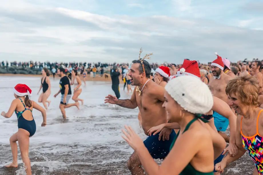 Après la baignade, place à un moment convivial autour du grand bûcher dressé sur la plage. Maillots, peignoirs et nœuds papillon sont de mise pour trinquer sur le sable : chacun est invité à apporter une bouteille de champagne pour fêter la nouvelle année.