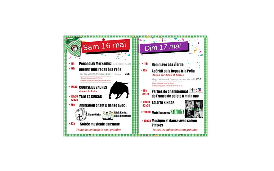 Fête de la Peña IdiakLe 17/05/2026HasparrenAnimations toute la journée autour de la Peña, qui fête ses 25 ans.