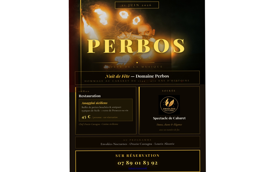 Le domaine Perbos s'enflamme pour la fête de la musique! Au programme : spectacle de cabaret avec Angélique Mougin et Tonia Massip, musique live avec Loaziz Akustic, et buffet sicilien par le chef Orazio Castagna. Réservation obligatoire.