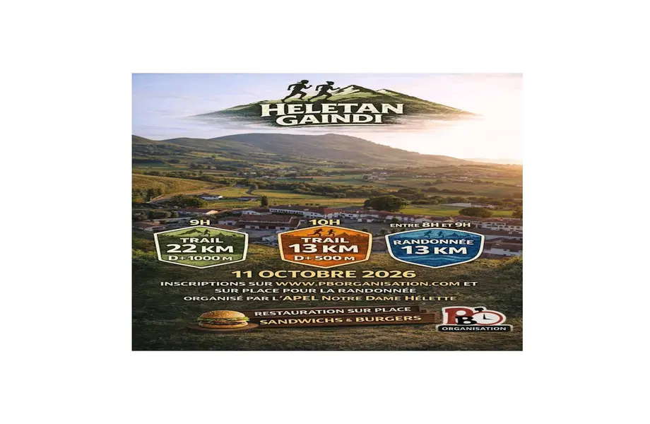 Randonnée pédestre HirukaskoLe 13/06/2026ItxassouRandonnée pédestre en montagne par équipes de 2 ou 3 personnes, sur une distance totale de 34 km. Départ entre 6 h 30 et 8 h.