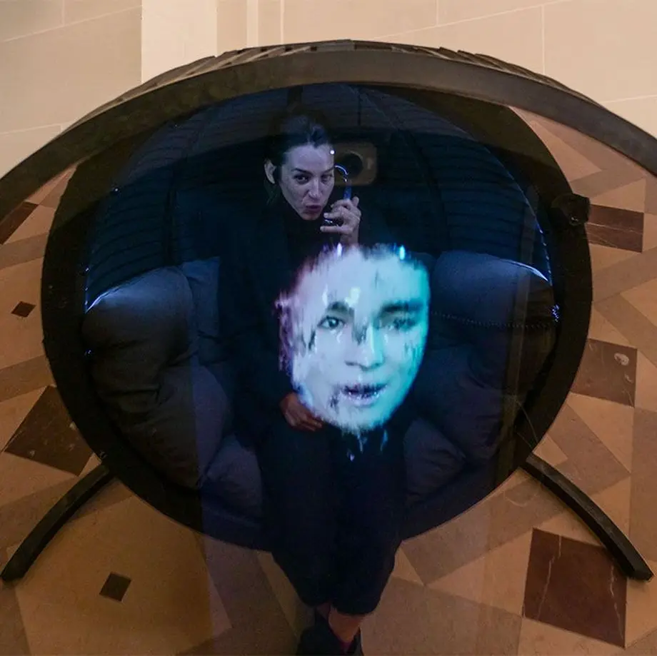 Bot°Phone prend la forme d’une cabine téléphonique rétro-futuriste. Le public est invité à s’y installer, isolé phoniquement, pour dialoguer avec un personnage de fiction animé par l’I.A. Face à un miroir-écran, le visage du spectateur est capté : ses expressions donnent vie aux visages 3D du personnage. Un jeu de reflets, où les identités se brouillent à chaque réplique.