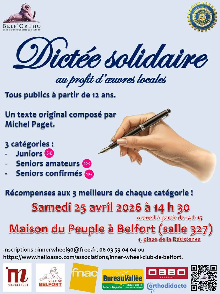 Le club d'orthographe Belf’Ortho et l'association Inner Wheel de Belfort organisent une dictée au profit d’œuvres locales le samedi 25 avril 2026, à 14 h 30, à la salle 327 de la Maison du Peuple à Belfort (1, place de la Résistance).
