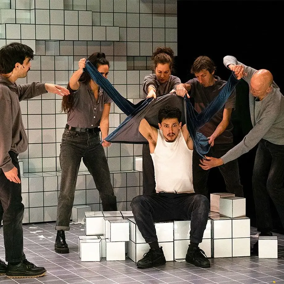 La scénographie constituée de centaines de cubes en céramique blanche est manipulée par les protagonistes autant qu’elle les manipule, se resserrant tandis que la focale de la pièce elle-même se réduit au fil des actes. Dans ce théâtre d’objets où un seul objet se démultiplie à l’infini, la déstructuration soulignée par la musique électro comme par la répétition de dialogues est à l’œuvre, déroulant une mécanique aussi implacable que féroce.
