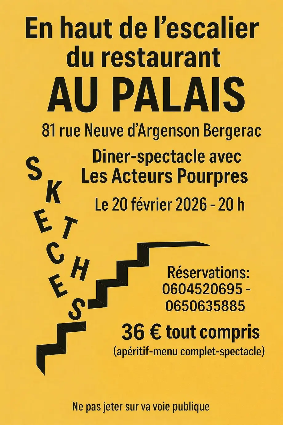 Après avoir gravi les 19 marches vous arriverez dans la salle où un repas vous sera servi et où les acteurs pourpres. Environ 8 artistes. Vous feront sourire voire rire avec leurs sketches humoristiques servis entre chaque plat. Bonne humeur garantie. Un petit moment de détente bien apprécié de nos jours