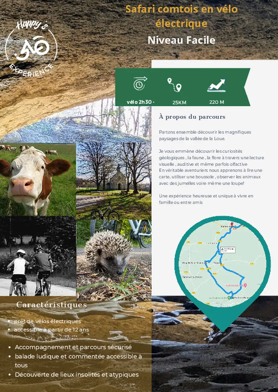 Balade commentée et accompagnée en vélos électriques * de 2h30 pendant laquelle nous irons chercher les animaux franc-comtois. En vrais aventuriers, nous apprendrons à lire une carte, utiliser une boussole et, bien sûr, prendre le temps d'observer les animaux avec des jumelles ou la loupe !