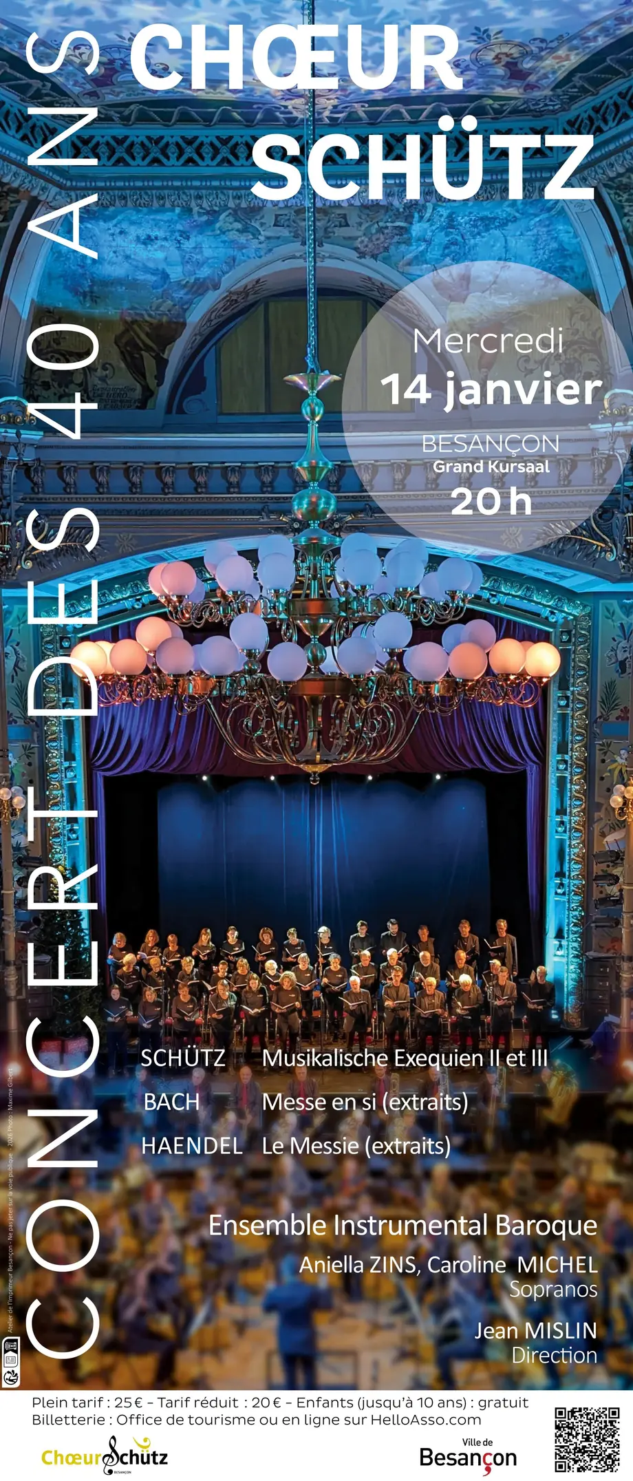 Le Chœur Schütz de Besançon a fêté ses quarante ans d’existence en 2025. Le public est convié à un grand concert anniversaire le mercredi 14 janvier 2026 à 20h au Grand Kursaal. Il sera accompagné par un ensemble instrumental jouant sur instruments anciens, et deux sopranos solistes : Aniella Zins et Caroline Michel, sous la direction de Jean Mislin .