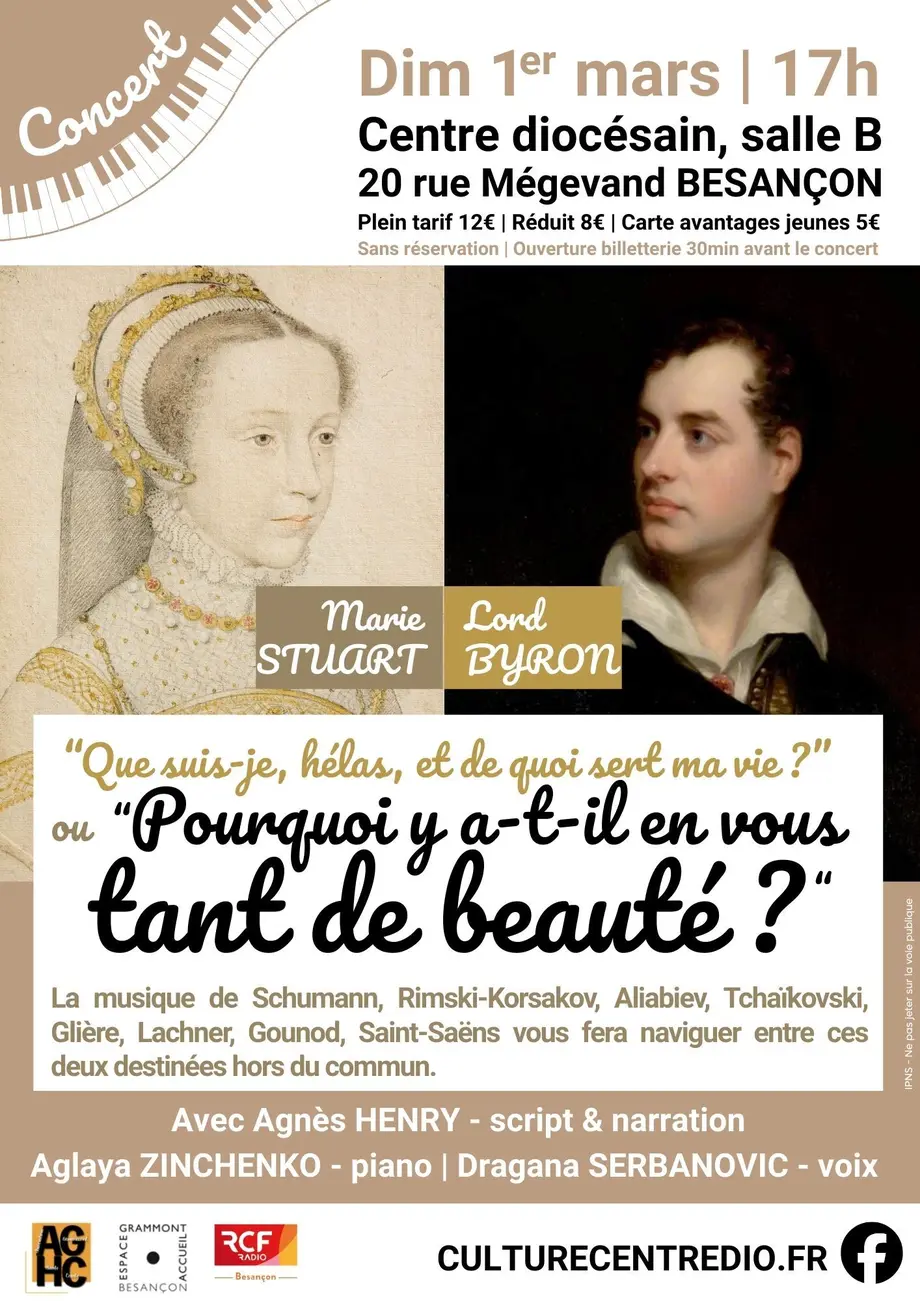Retrouvez Aglaya Zinchenko au piano, Dragana Serbanovic à la voix et Agnès Henry à la narration lors d’un concert autour des poèmes de Marie Stuart et Lord Byron et les musiques de Schumann, Rimski-Korsakov, Aliabiev, Tchaïkovski, Glière, Lachner, Gounod, Saint-Saëns, dimanche 1er mars à 17h, au Centre diocésain (salle B) de Besançon. Billetterie avant le concert : plein tarif 12€ / réduit : 8€ / carte avantages jeunes 5€.