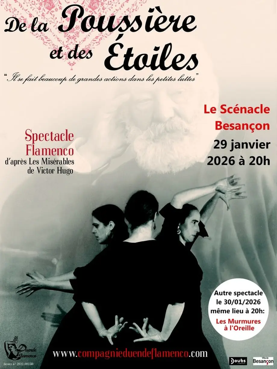 En 2027, Duende Flamenco fêtera ses 20 ans ! En amont de cet événement, nous proposons deux spectacles emblématiques de la Compagnie : « De la Poussière et des Etoiles » et « Les Murmures à l’Oreille » au Scénacle de Besançon les 29 et 30 janvier 2026.