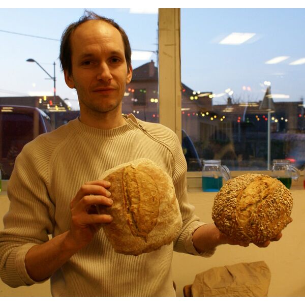 « Je fais du pain bio au levain, sur meule de pierre et avec un four à bois. Pour ma farine, je me fournis chez des producteurs locaux, ce qui permet de réduire les transports et respecter l'environnement. Le système de panier me donne une garantie pour la vente sur six mois mais il y a autant d'incertitudes au moment du réabonnement. Car si ça ne marche pas, la demande s'éteint d'un bloc. Ce système des paniers me permet d'avoir une vie car si je devais travailler uniquement en direct, je devrais me lever à minuit pour travailler et je serai complètement décalé. Or, je fais un produit naturel et je veux être en phase avec ce produit. C'est aussi important pour moi de sortir du fournil et d'être au contact du client. Là, j'ai fait un essai avec un pain sans gluten que je propose à la dégustation : je l'ai fait ce matin-même, alors je peux répondre à toutes les questions des consommateurs. »