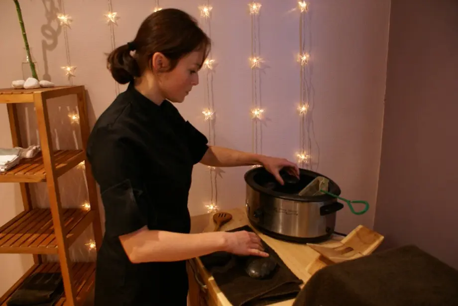 Au creux de l'hiver, quand il fait bien froid, le massage avec les pierres chaudes connaît un regain d'intérêt. Ces pierres d'origine volcanique sont choisies par leur capacité à conserver longtemps la chaleur. Pendant que le client s'installe sur la table de massage, le masseur va faire sa petite préparation en chauffant les pierres volcaniques au bain-marie. Il va ensuite passer de l'huile sur le corps du client, poser les pierres chaudes de différentes tailles, à divers endroits du corps : sur les pieds ou entre les orteils, sur les bras ou sur le visage.
